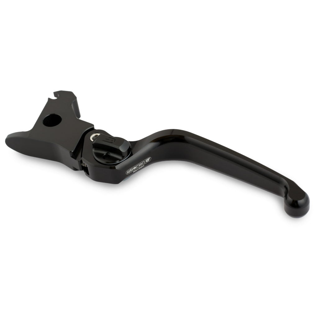 Adjustable motorcycle clutch levers by Oberon Performance. Adjustment is achieved with fingertip control in either adjuster direction. The eight adjustments are either side of position 4 (similar to stock) giving adjustment up to 30mm (1 1/8″) of lever travel. Our unique RADIAL CAM® design achieves this extraordinary range with ease. This is mainly due to both the close tolerance design and the high precision quality roller, around which the cam operates locating each position with a comforting ‘click’. Each lever is dispatched fully assembled in the style and colour of your choice ready for use. Oberon Performance supplies a full specification sheet including part numbers with all levers. Available in 3 blade styles, Standard, AirO and Custom.